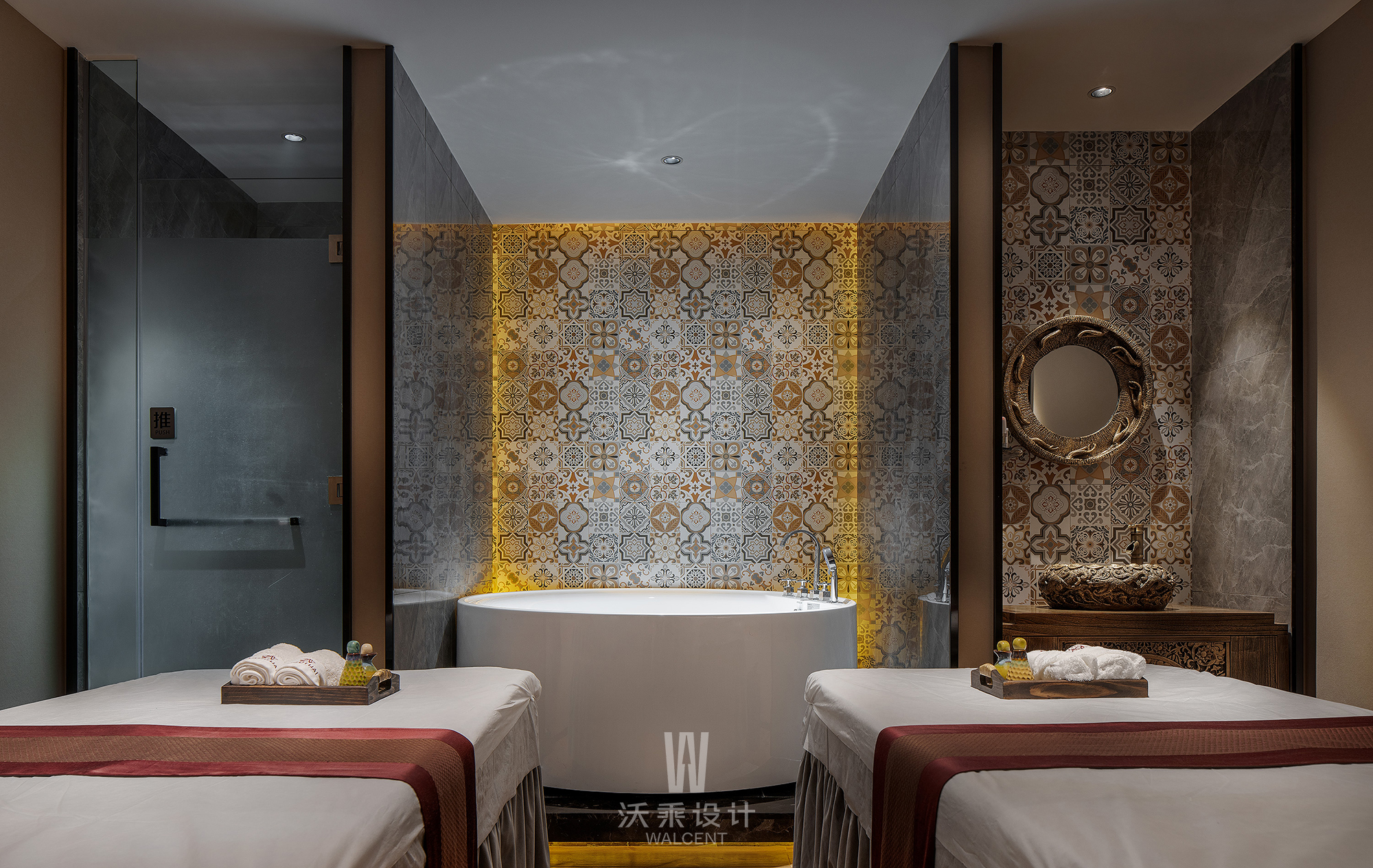 古泰SPA 泰式水疗会所的空间是品牌定位,高端SPA品牌气质的完美诠释。从门头风格,格栅创意,到形象背景墙、硬装造型,软装配饰都根据古泰SPA品牌的DNA,超级创意符号来进行设计,形成了独有的品牌气质,和传统装修的拿来主义,机械堆砌泰国物件的品牌拉开了质的距离。